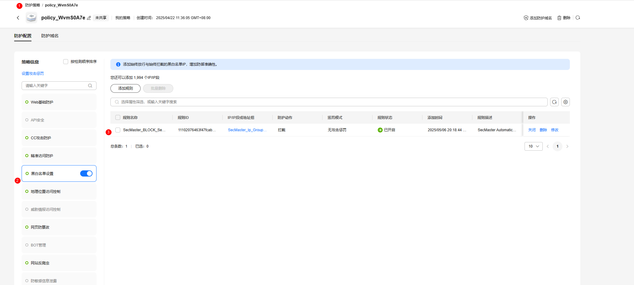 - 剧本触发后,在Web应用防火墙 WAF侧的可查看,WAF自动新建的IP地址组已绑定WAF已有的防护策略。