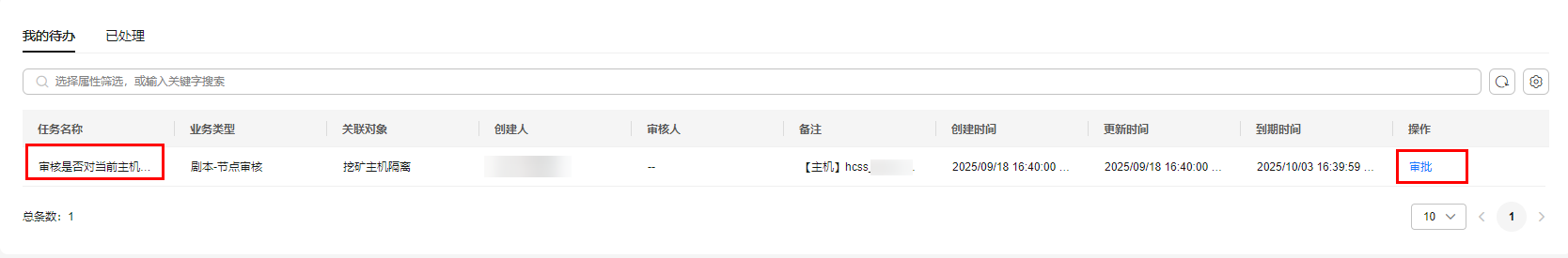 - 当存在“告警类型”为“挖矿程序”或“挖矿软件”的主机告警时,剧本“挖矿主机隔离”会自动生成对告警所属主机进行自动隔离的待办。在安全云脑工作空间的左侧导航栏选择 ,进入“我的待办”页面,可查看任务名称为“审核是否对当前主机进行隔离”的任务,且“关联对象”是“挖矿主机隔离”。