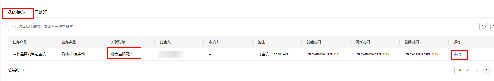 - 当存在“告警类型”为“勒索软件”的主机告警时,剧本“勒索主机隔离”会自动生成对告警所属主机进行自动隔离的待办。在安全云脑工作空间的左侧导航栏选择 ,进入“我的待办”页面,可查看任务名称为“审核是否对当前主机进行隔离”的任务,且“关联对象”是“勒索主机隔离”。