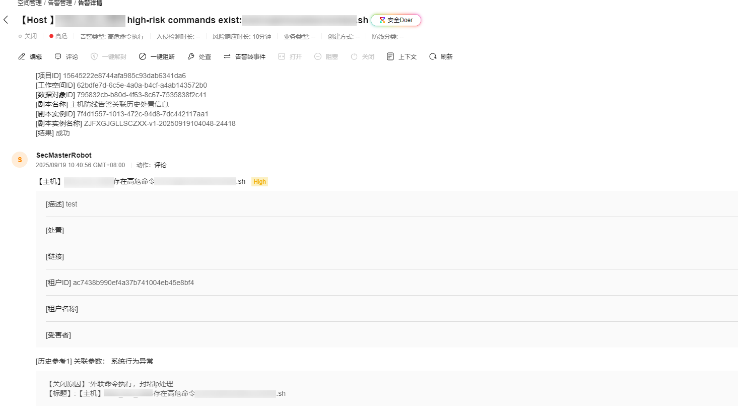 当安全云脑在15天内新增了HSS的告警,且存在已被关闭的HSS告警,则“主机防线告警关联历史处置信息”剧本会将已关闭HSS告警的关闭评论添加到新增的相似HSS告警评论区中。