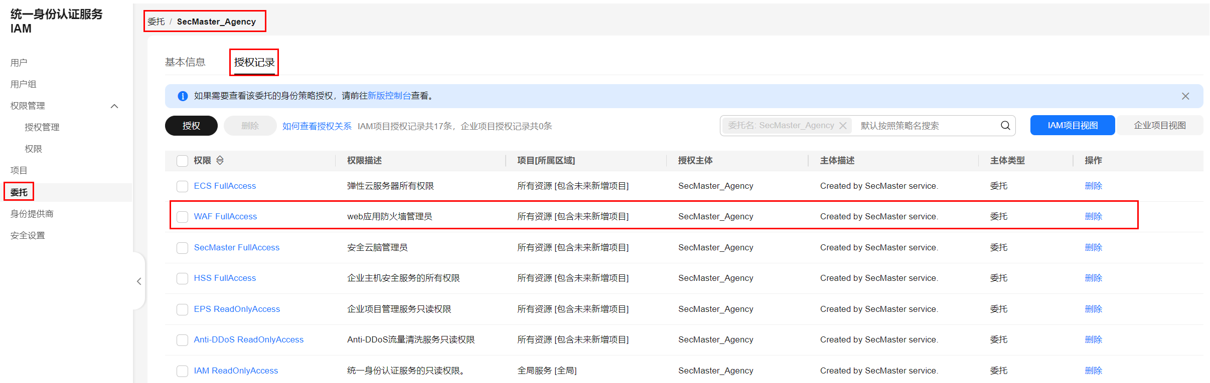 可参考以下步骤查看安全云脑是否已获得“WAF fullAccess”权限。若未授权,请参考服务委托授权进行授权。