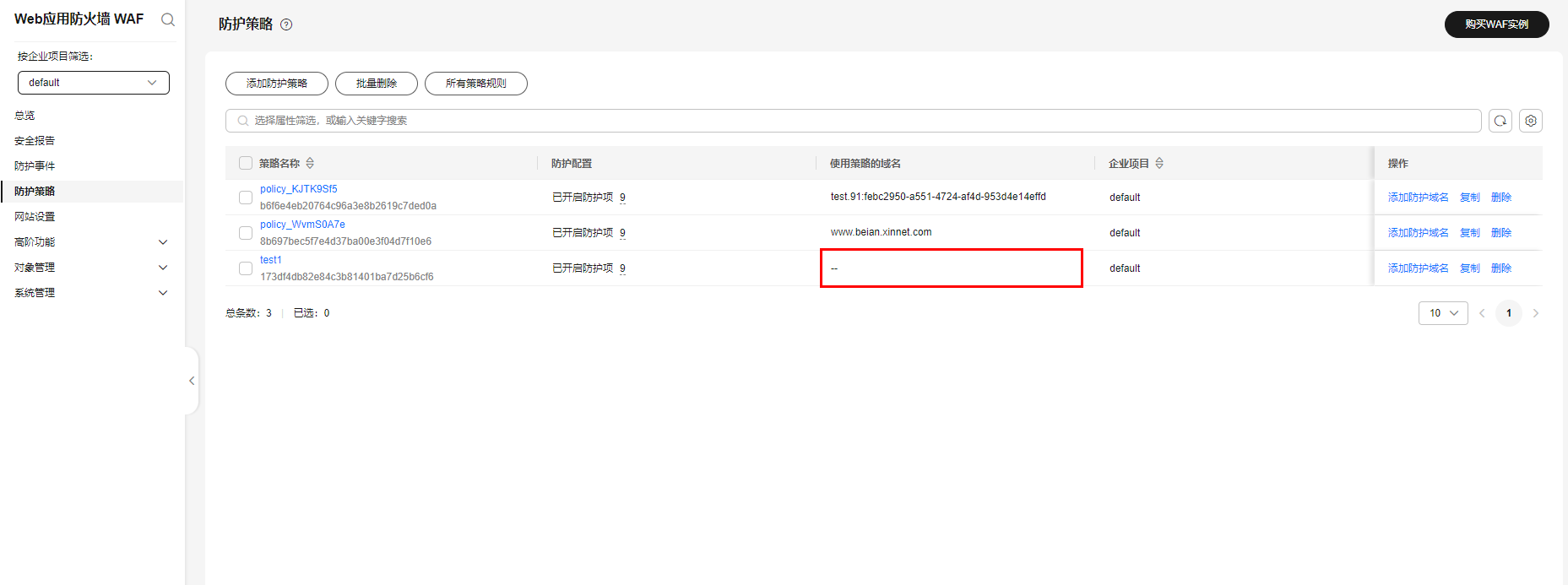 - 在左侧导航栏,单击“防护策略”,查看防护策略列表。其中WAF的空防护策略指的是只有策略名称没有防护域名的防护策略。