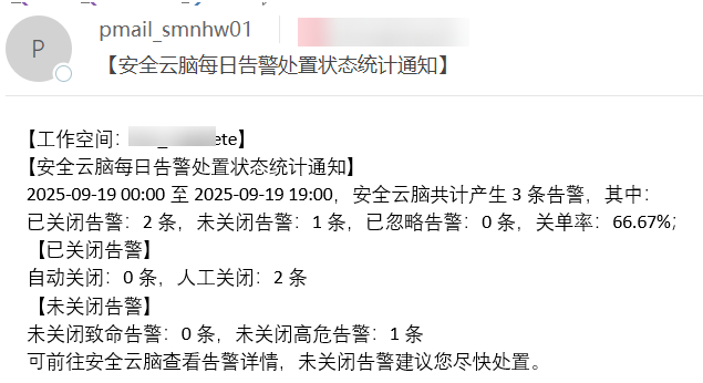 “未关闭告警自动统计通知”剧本每天19:00自动统计安全云脑未关闭的告警信息并发送邮件/短信通知给用户。通知示例如下: