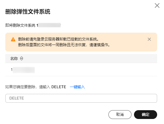 通用文件系统删除后,通用文件系统中存放的数据将无法恢复。为避免数据丢失,执行删除操作前,请确认存放在该通用文件系统中的文件都已经在本地备份。