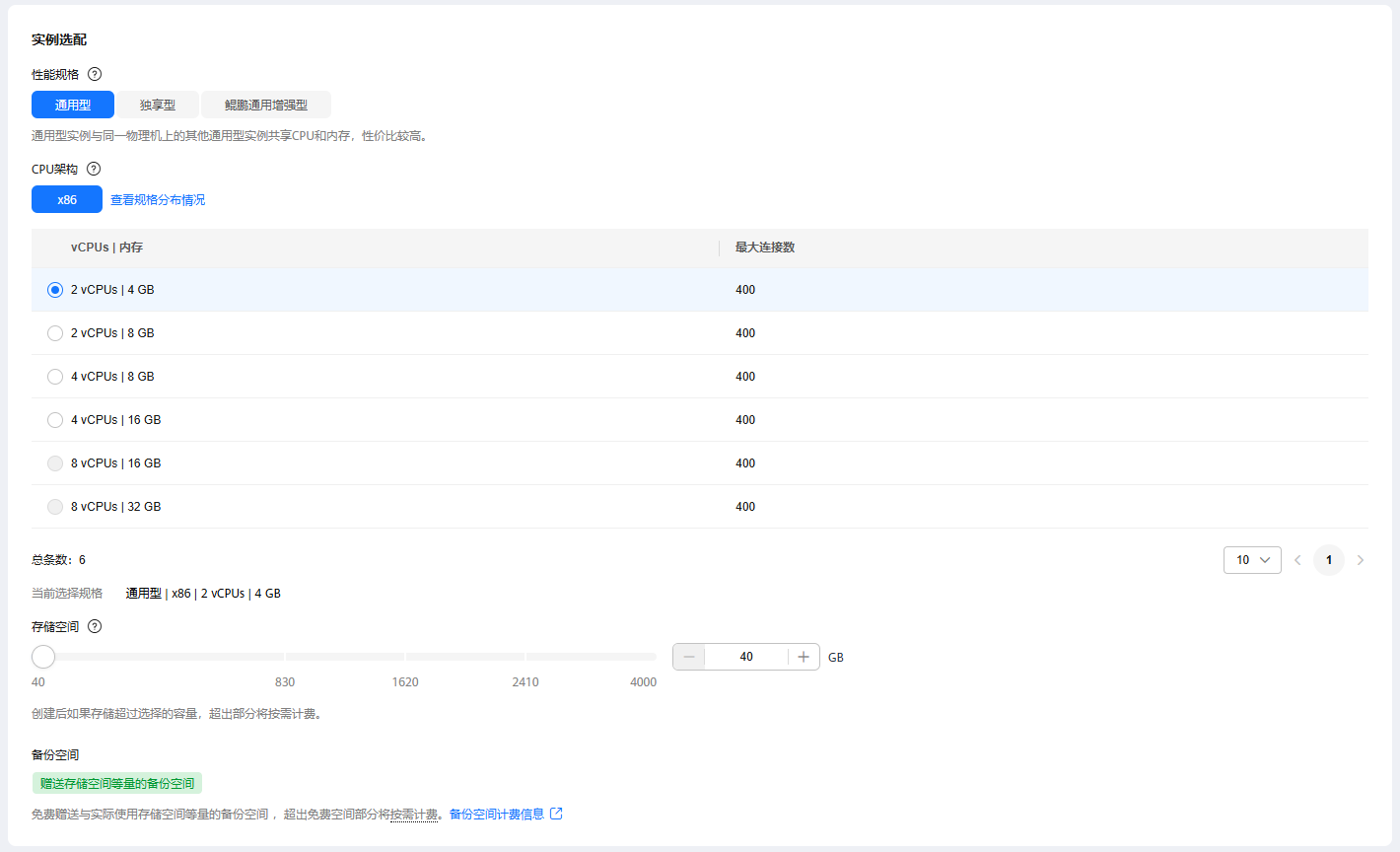 实例的CPU和内存。不同性能规格对应不同连接数和最大IOPS。