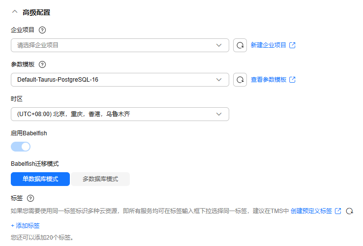 可选配置,TaurusDB for PostgreSQL数据库的标识。使用标签可以方便识别和管理您拥有的TaurusDB数据库资源。每个实例最多支持20个标签配额。