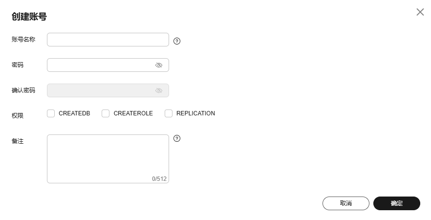 - 在弹出框中,输入账号名称、密码、权限和备注,单击“确定”。