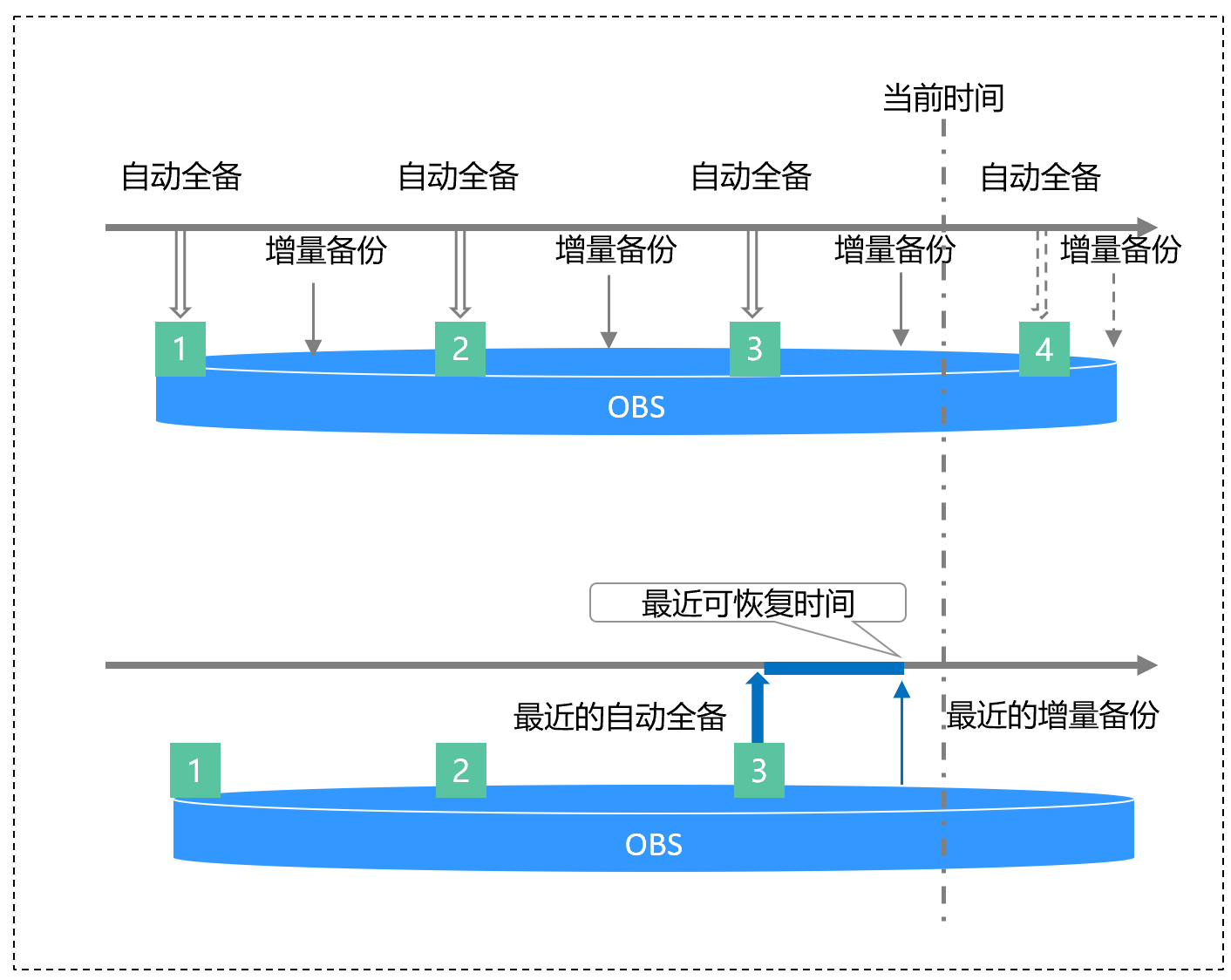 TaurusDB for PostgreSQL默认开启自动备份,且不支持关闭。TaurusDB for PostgreSQL自动全备按照备份策略中的备份时间段和备份周期进行全量备份。增量备份为实例每5分钟对上一次自动全备,或增量备份后更新的数据会进行备份,以保证数据库可靠性。实例恢复到指定时间点,会从OBS备份空间中选择一个该时间点最近的全量备份下载到实例上进行全量恢复,再重放增量备份到指定时间点。