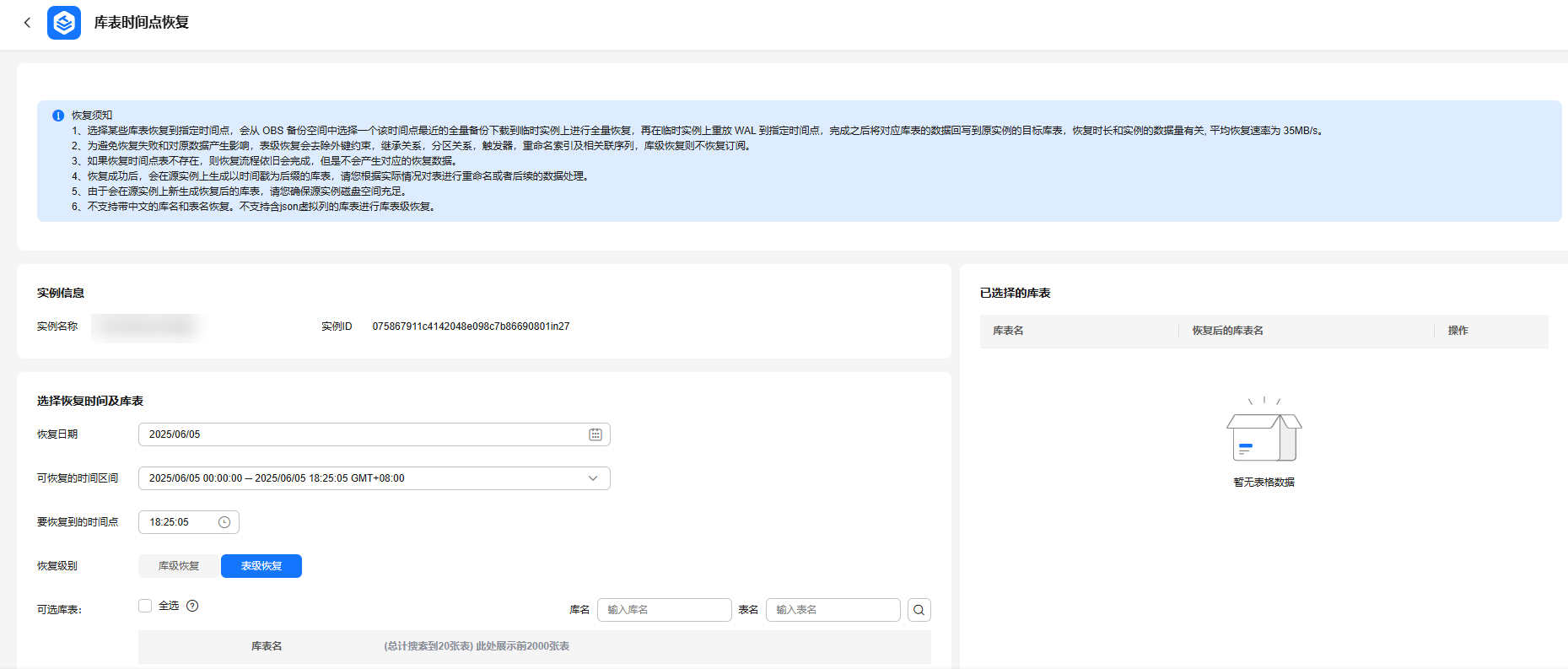 - 表级恢复时,单个实例一次最多恢复20000张表。当需要恢复的表数量超过20000张时,建议您使用恢复到指定时间点功能进行恢复,具体请参考全量数据恢复:恢复到指定时间点。