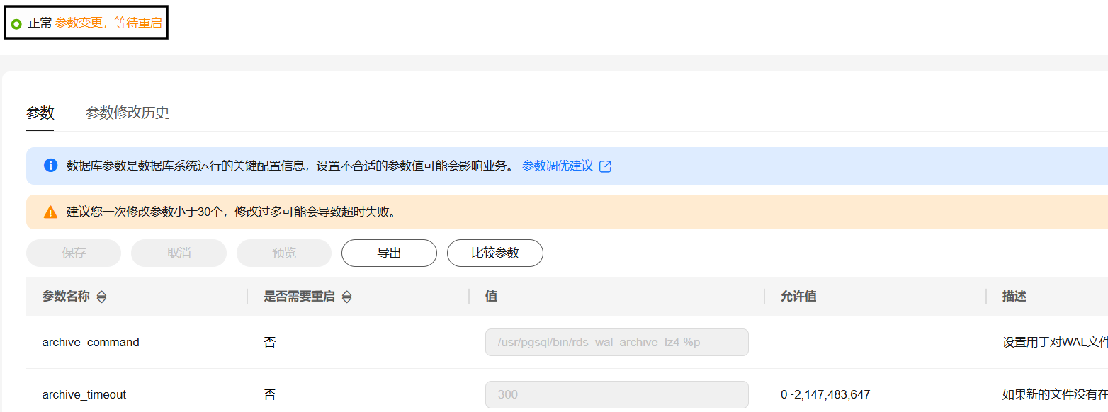 如果显示“参数变更,等待重启”,则需重启实例使之生效;否则,无需重启。