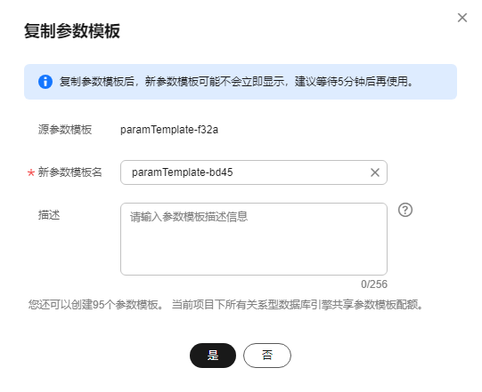 复制数据库参数模板之后,新参数模板可能不会立即显示,建议您等待5分钟再使用。