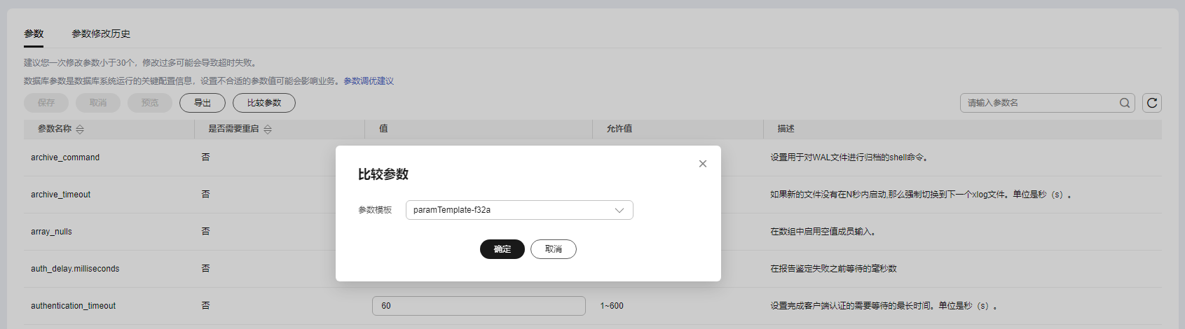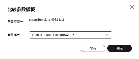 - 选择同一数据库引擎的不同参数模板,单击“确定”,比较两个参数模板之间的配置参数差异项。