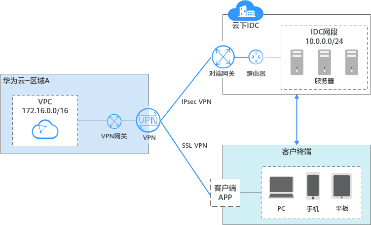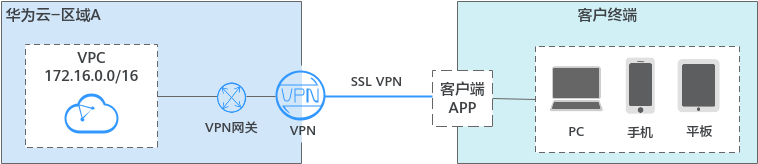 客户终端通过VPN接入华为云时,建议您选用SSL VPN。SSL VPN是一种基于SSL协议的虚拟专用网络技术,允许远程用户通过加密的方式安全地访问企业内部网络资源。详情请参见通过终端入云VPN实现移动端和VPC互通。