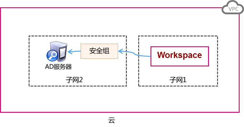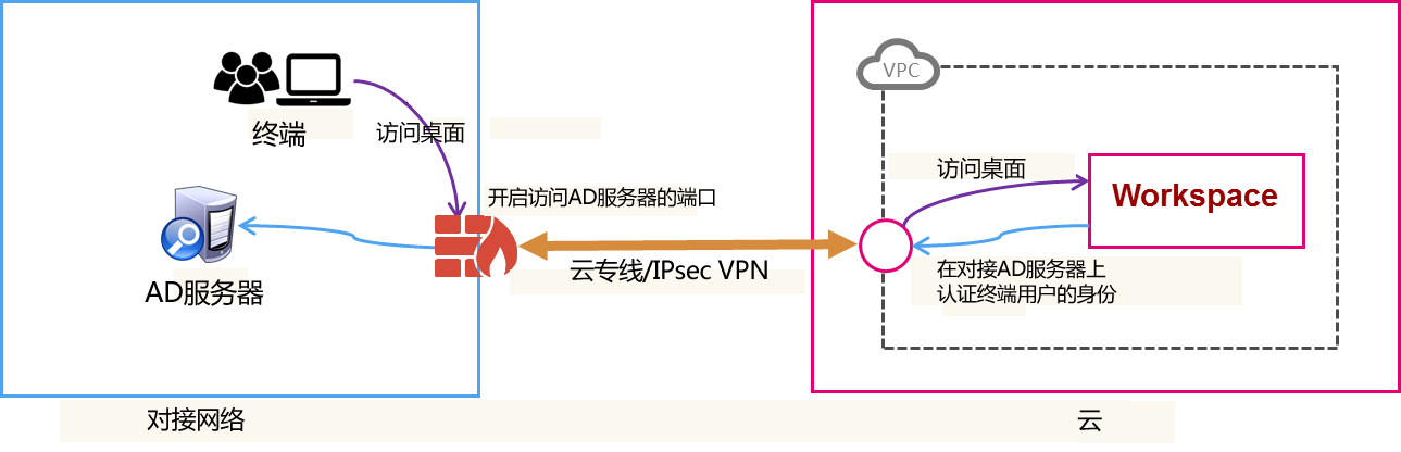 Windows AD部署在企业内网或和云桌面在同一个VPC内的情况下,如果云桌面使用Windows AD进行认证,需要先配置云桌面和Windows AD网络互通。