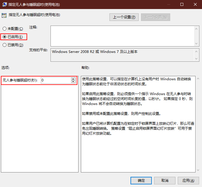 - 在睡眠设置右侧双击“指定无人参与睡眠超时(使用电池)”,弹出“指定无人参与睡眠超时(使用电池)”对话框,选择“已启用”,“无人参与睡眠超时(秒)”设置为“0”。