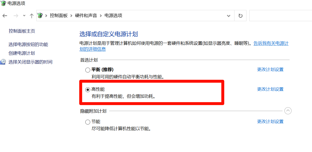- 进入“控制面板>硬件和声音>电源选项”页面,将电源首选计划勾选至“高性能”/“卓越性能”;