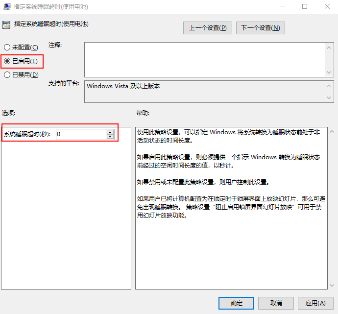 - 在睡眠设置右侧双击“指定系统睡眠超时(使用电池)”,弹出“指定系统睡眠超时(使用电池)”对话框,选择“已启用”,“系统睡眠超时(秒)”设置为“0”。
