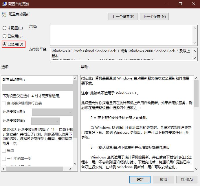 - 在配置自动更新窗口中,选择“已禁用”,单击“确定”,如图13所示。