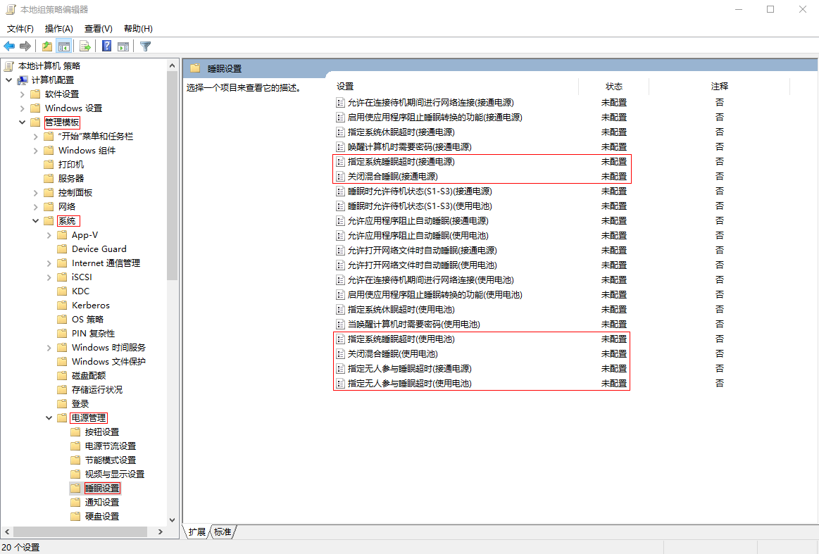 - 在导航树中依次选择“计算机配置 > 管理模板 > 系统 > 电源管理 > 睡眠设置”依次启用“指定系统睡眠超时(接通电源)”、“关闭混合睡眠(接通电源)”、“指定系统系统睡眠超时(使用电池)”、“关闭混合睡眠(使用电池)”、“指定无人参与睡眠超时(接通电源)”、“指定无人参与睡眠超时(使用电池)”,如图2所示