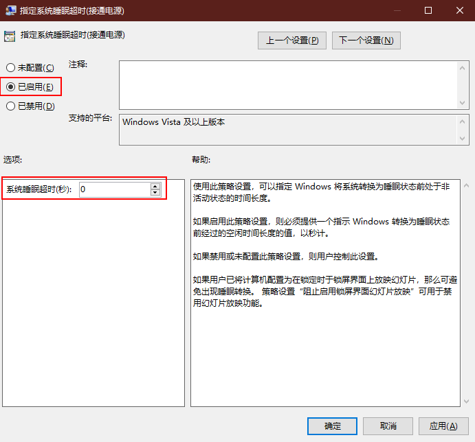 - 在睡眠设置右侧双击“指定系统睡眠超时(接通电源)”,弹出“指定系统睡眠超时(接通电源)”对话框,选择“已启用”,“系统睡眠超时(秒)”设置为“0”。