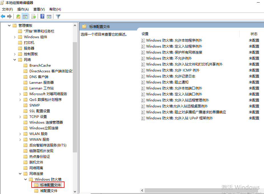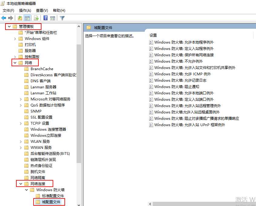 - 在本地组策略编辑器导航树中,选择“计算机配置 > 管理模板 > 网络 > 网络连接 > Windows 防火墙 > 域配置文件”。