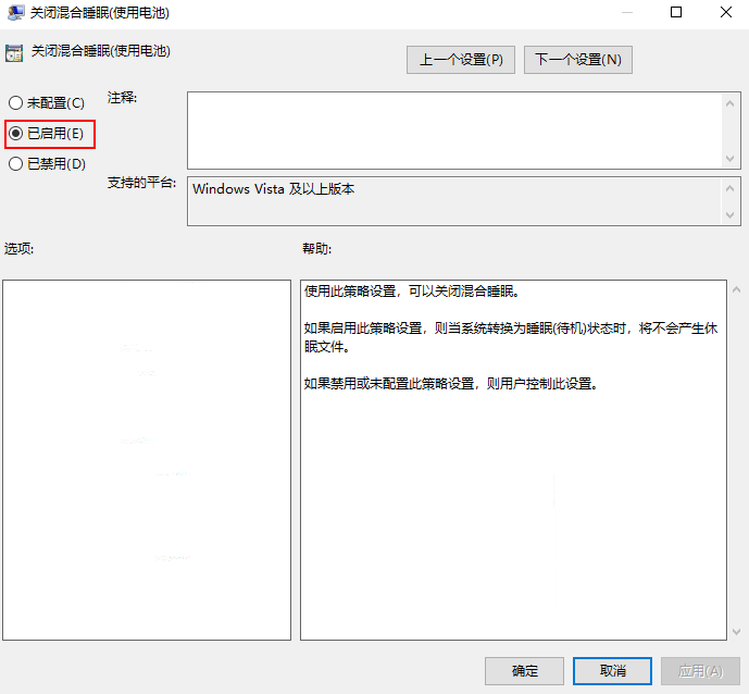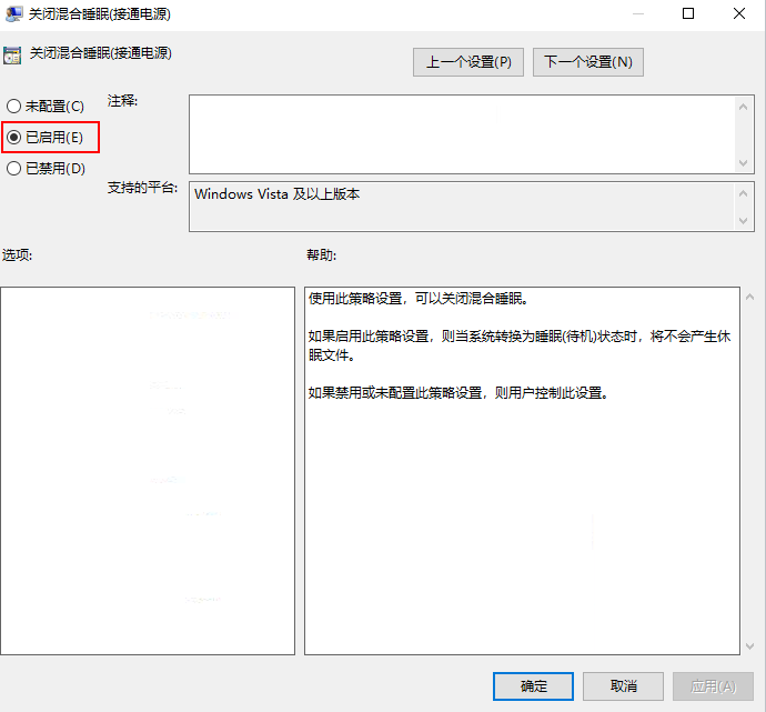 - 在睡眠设置右侧双击“关闭混合睡眠(接通电源)”,弹出“关闭混合睡眠(接通电源)”对话框,选择“已启用”。