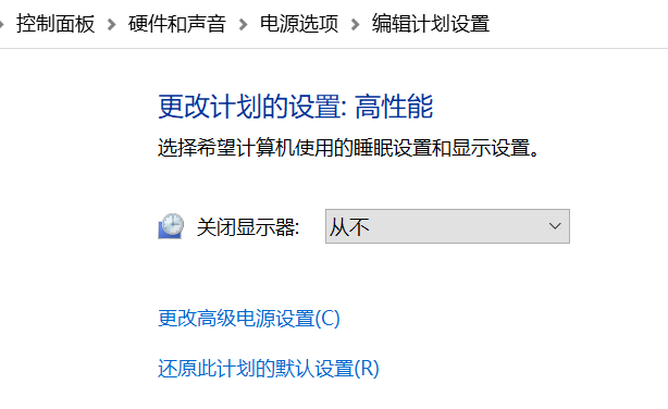 - 点击“高性能”/“卓越性能”右侧的更改计划设置,进入二级页面后,将关闭显示器设置为“从不”;