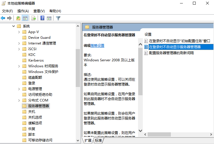 - 在右边窗格中,双击“在登录时不自动显示服务器管理器”。