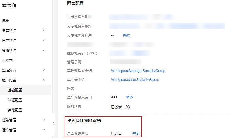 - 在“租户配置”页面的“桌面退订/删除配置”区域,根据实际需要选择对应操作。