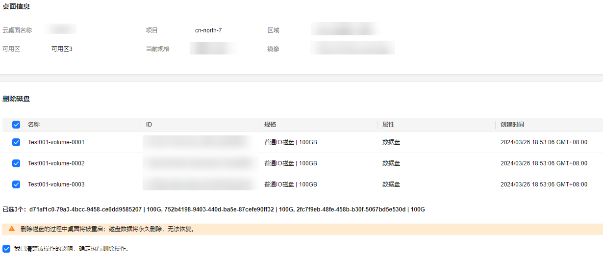 用户业务量变更,数据盘冗余时。或者用户临时需要增加大容量存储的,使用完后需要卸载并退订大容量的磁盘时。可参考本章节删除磁盘。删除数据盘后,对应磁盘数据将永久删除,无法恢复。建议只在能确定用户桌面的磁盘分区与数据盘对应关系等特定场景删除数据盘,例如只有一个数据盘或者可以通过磁盘容量区分数据盘的情况,选择删除数据盘。