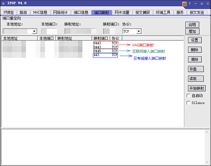- 在IPOP工具窗口选择“端口映射”页签,配置端口映射,配置VAG映射、互联网接入映射或云专线接入映射。