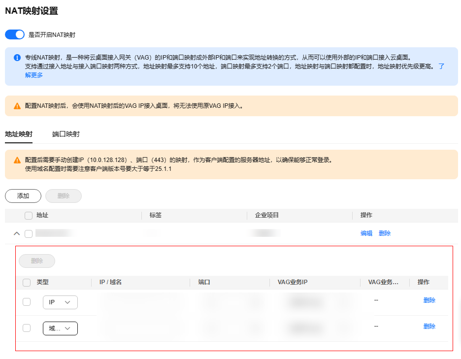 - 映射地址:租户配置下NAT映射中配置的VAG IP。