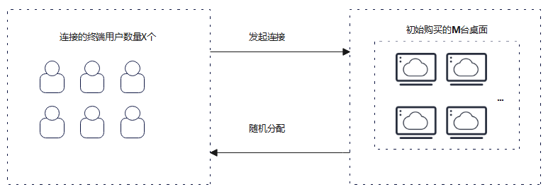 - 面向多人复用资源池(N:M)的桌面方案:即多个用户(N)共享固定数量桌面(M),通过自动调度实现资源复用。