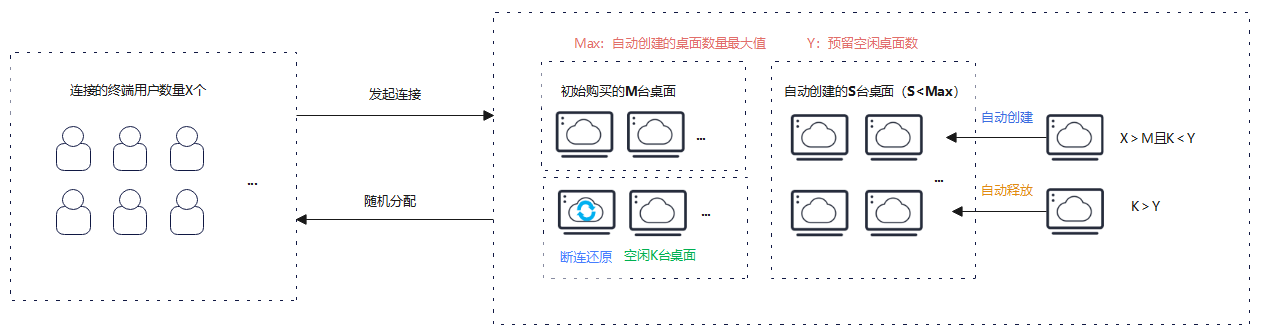 - 开启扩缩容策略:初始创建 M 台桌面,可配置最小桌面数为N台,预留空闲桌面数量为 Y 台,自动创建桌面的最大值为 Max 台,配置空闲桌面保留时长为 H 分钟,后续将根据终端用户的连接情况自动创建桌面。