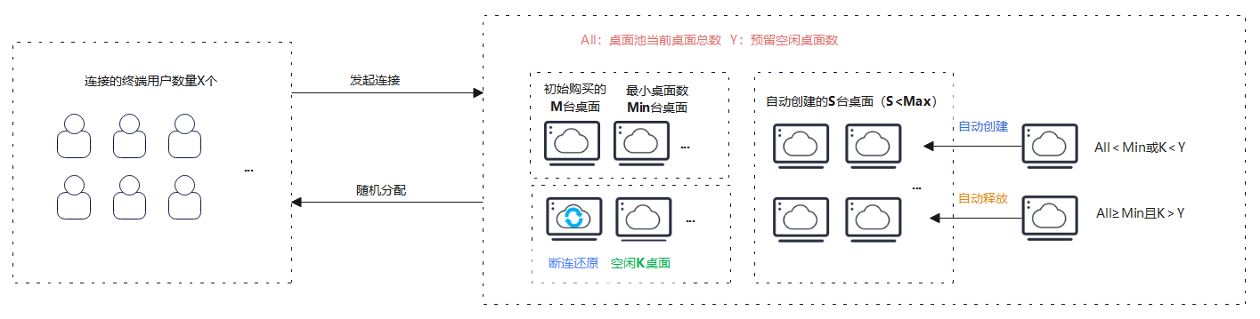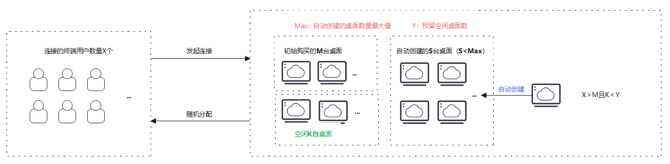- 开启扩缩容策略:初始创建 M 台桌面,预留空闲桌面数量为 Y 台,自动创建桌面的最大值为 Max 台,配置空闲桌面保留时长为 H 分钟,后续将根据终端用户的连接情况自动创建桌面。