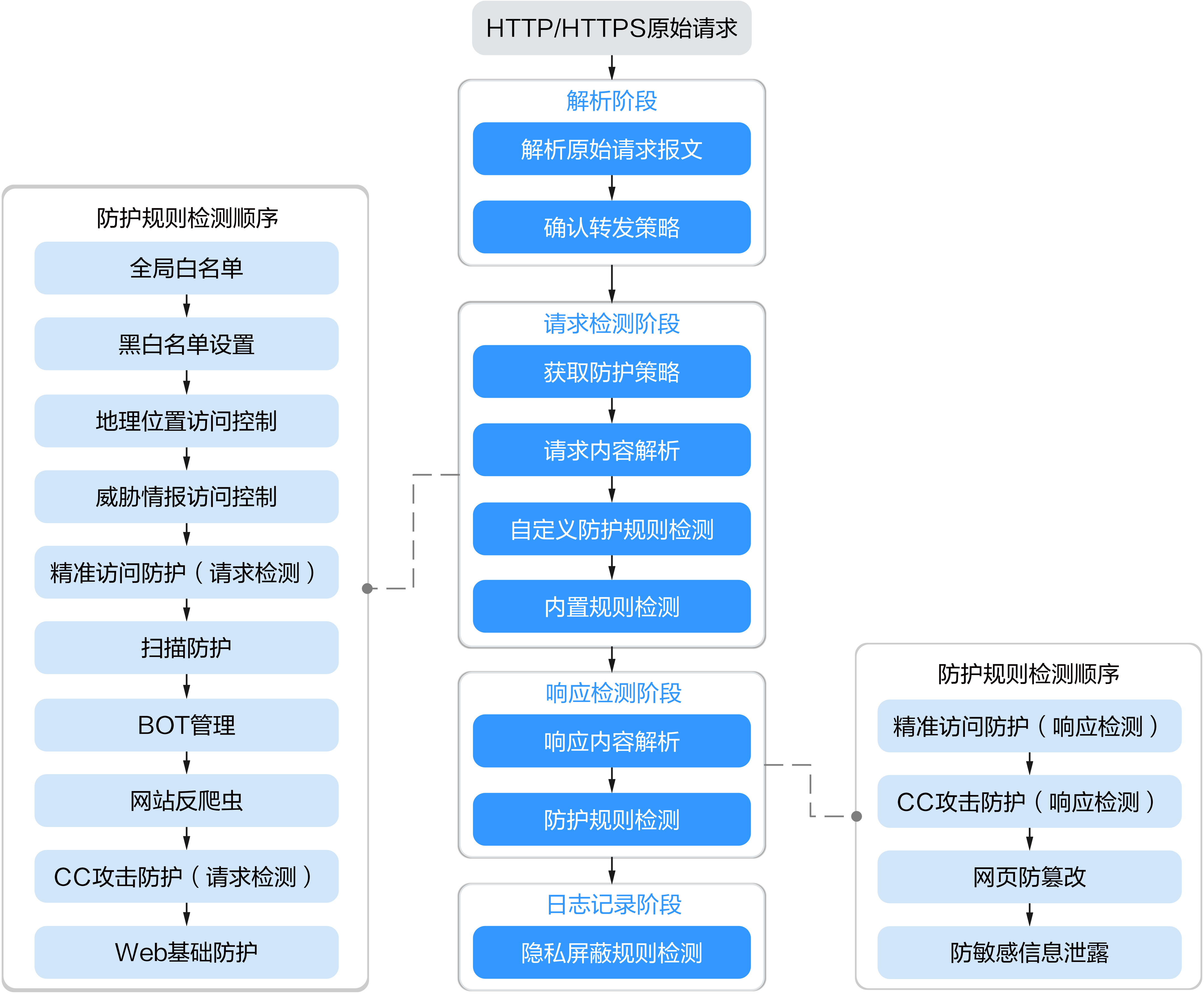 针对HTTP/HTTPS原始请求,WAF引擎内置防护规则的检测流程如图1所示。