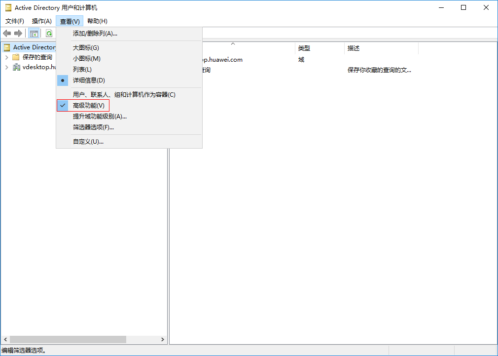 - 打开Active Directory 用户和计算的高级功能,如图1所示。
