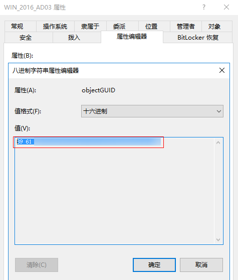 - 在属性编辑器页签,下拉选择objectGUID属性目录,双击查看objectGUID的值,如图3所示。
