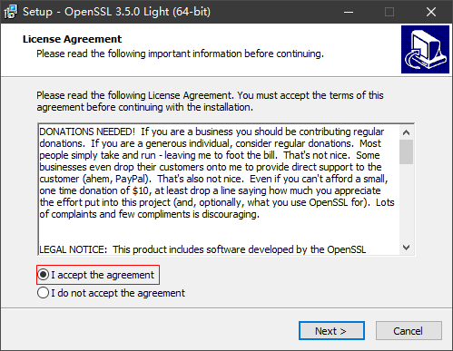 - 在WindowsPC或ECS服务器中,双击安装包,勾选“I accept the agreement”,单击“Next”,如下图所示。
