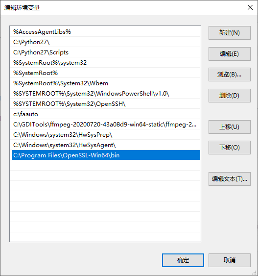 - 设置环境变量,例如,工具安装在C:\Program Files\OpenSSL-Win64目录,将C:\Program Files\OpenSSL-Win64\bin复制到用户变量或系统变量的Path中,如图4所示。