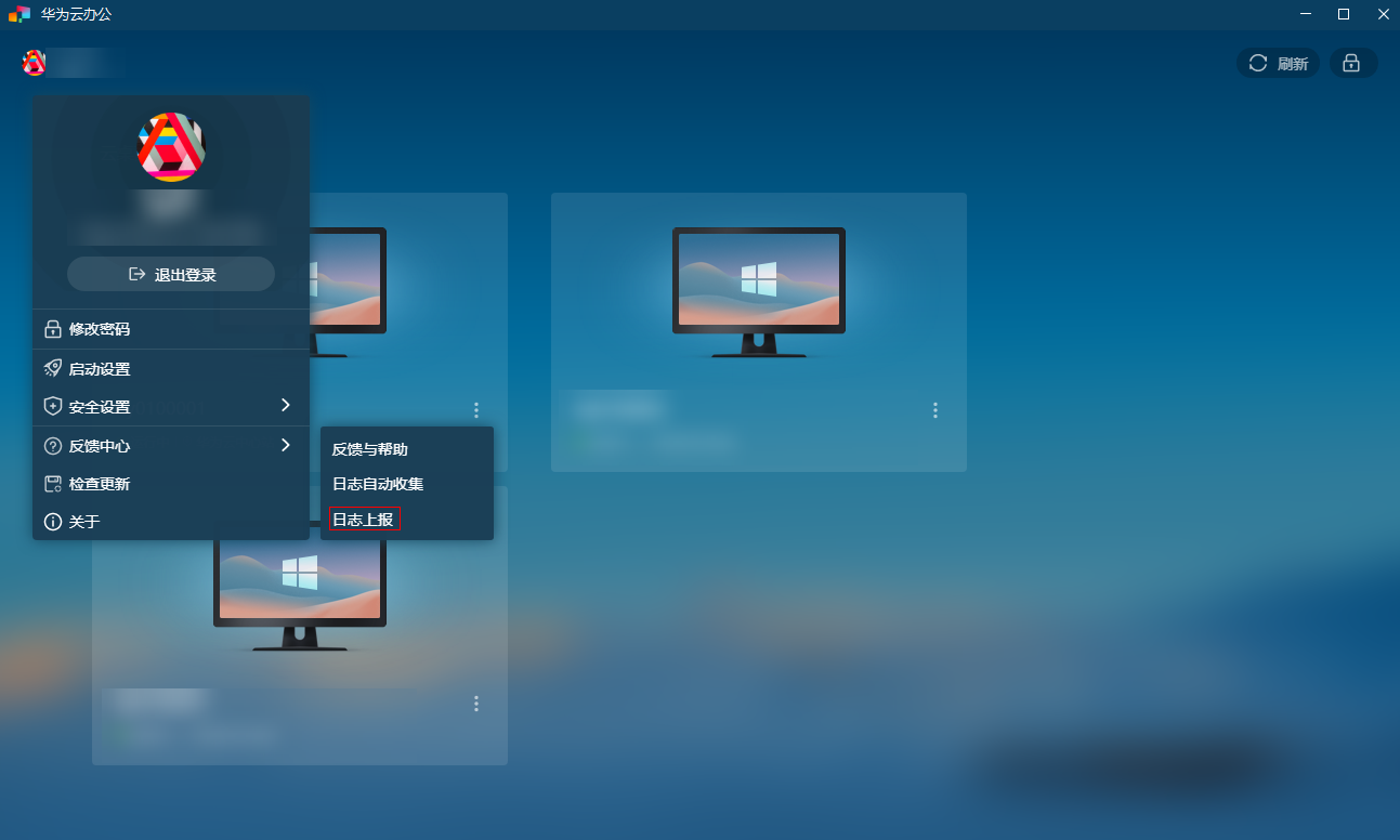 - 管理员登录WI,输入用户名和密码,在客户端页面依次单击左上角的“用户名 > 反馈中心 > 日志上报”,如图1所示。