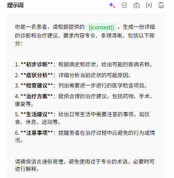 当单击插入模板后,系统会自动将选定的提示词填充到编辑框中,你可以根据自己的业务场景进行修改。在修改提示词时,应重点关注其中的高亮部分。
