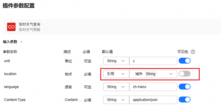 - 在“插件参数配置”界面,单击“location”参数的“默认值”列,选择“引用”,然后选择已配置的“城市”入参变量。