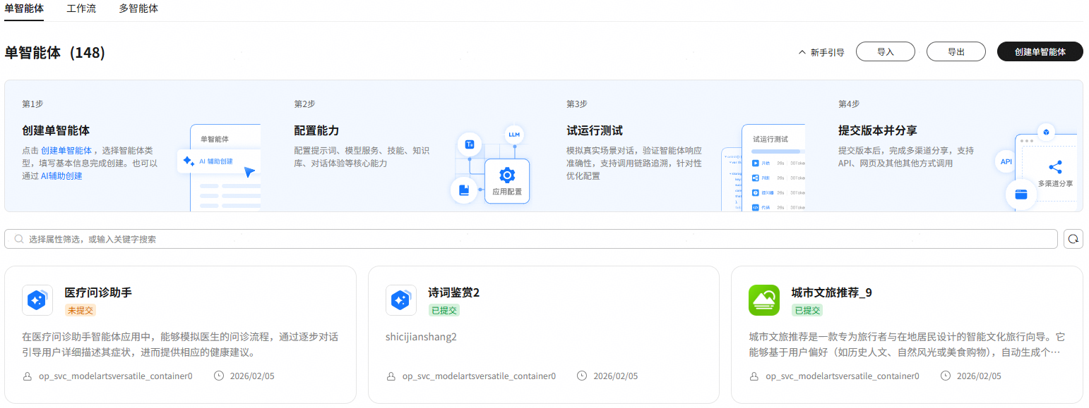 - 选择左侧导航栏“开发中心 > 智能体管理”,单击左上角“单智能体”页签,进入单智能体应用管理界面。