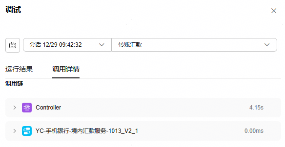 - 调用详情:在多智能体应用会话时,调用链中展示控制器或工作流的详细信息,包括运行的控制器或工作流、控制器或工作流耗时、控制器或工作流的输入和输出信息等。便于开发者快速地追溯操作顺序并精确定位问题。单击“查看子工作流调用链”,可以查看工作流中每个节点的详细信息,包括运行的节点、节点耗时、节点的输入输出。