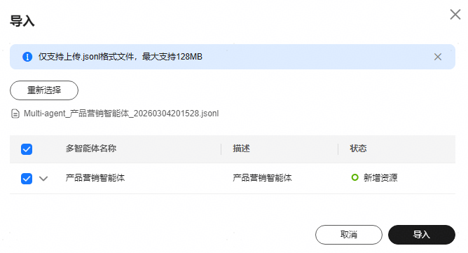 已有从其他AgentArts环境导出的多智能体应用的JSONL格式文件。