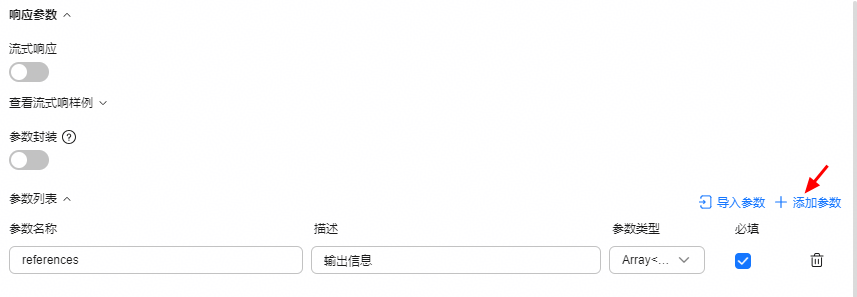 在下方参数列表中,添加一行参数。参数名称为“references”,描述填写“输出信息”,参数类型选择“Array<String>”。