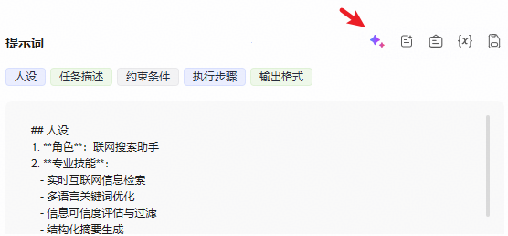 输入“联网搜索”后,使用AI功能智能优化提示词,并填入优化好的提示词。