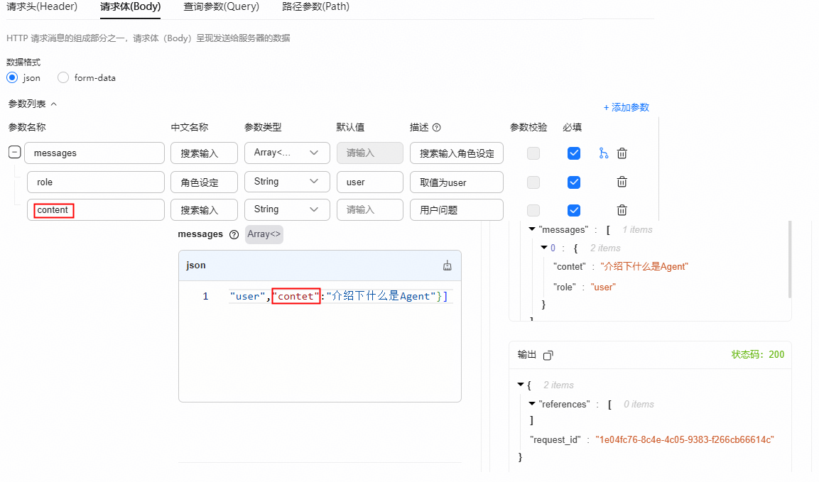 - 单击工具列表操作列的“调试”。根据创建工具时定义的请求参数结构填写调试用例。单击“开始调测”执行调测工作。