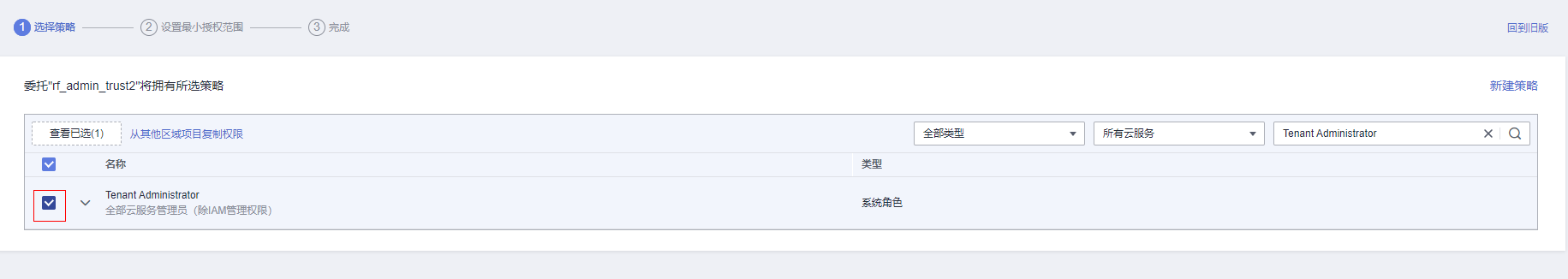 - 在搜索框中输入“Tenant Administrator”权限,并勾选搜索结果,单击“下一步”。